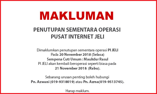JADUAL AKTIVITI APRIL 2019 PUSAT INTERNET JELI TARIKH AKTIVITI KUMPULAN SASARAN 1 APRIL 2019 TAKLIMAT & PANDUAN KEMASKINI UPU ONLINE LEPASAN SEK MEN 5 APRIL 2019 KLIK DENGAN BIJAK SEK RENDAH 6 APRIL 2019 KELAS ASAS ANIMASI SEK RENDAH 8 […]